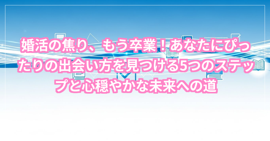 この記事を通じて、婚活の焦りを手放し、自分に合った方法で一歩踏み出すヒントを掴んでいただけたなら、とても嬉しいです。結婚はゴールではなく、新しい人生のスタート。そのスタートラインに立つために、今、焦りから解放されて、あなたらしい笑顔で進んでいきましょう。きっと、素敵な未来があなたを待っていますよ。あなたの幸せを、心から応援しています。さあ、一緒に新しい扉を開いていきましょう!