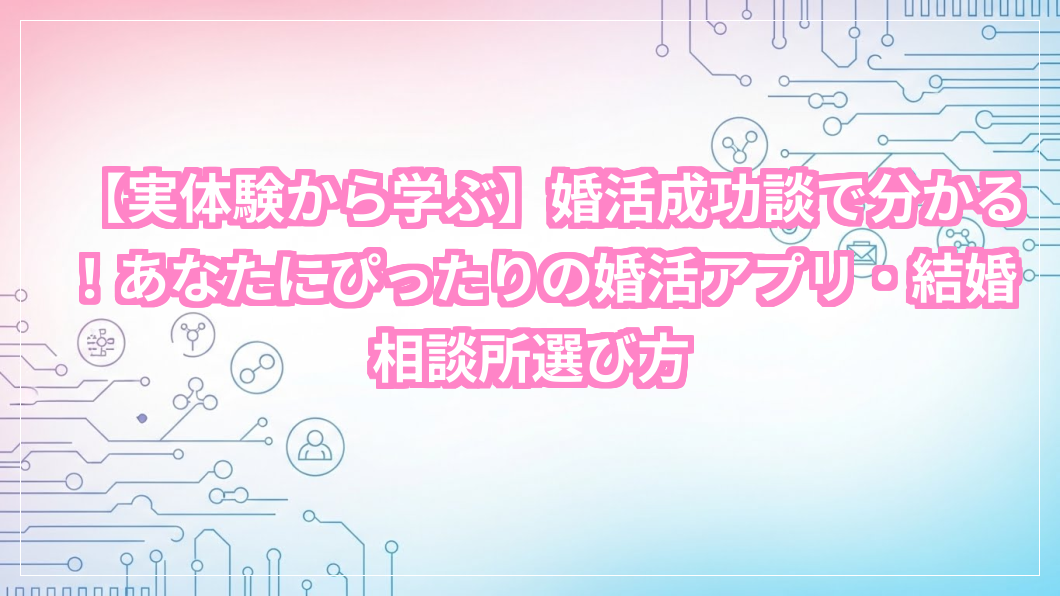 でも、大丈夫です!今日の記事では、たくさんの人が「理想のパートナーと出会えた」と語る婚活成功談からヒントを得て、あなたに本当に合った婚活アプリや結婚相談所の選び方を、まるで親しいカウンセラーのように優しく、そして具体的に解説していきます。この記事を読めば、きっと自分にぴったりの婚活方法が見つかり、一歩踏み出す勇気が湧いてくるはずですよ。