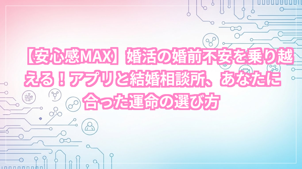 婚活アプリや結婚相談所を検討中のあなた。婚前不安という、なんだかモヤモヤした気持ちを抱えていませんか? 自分に合う婚活方法って何だろう、本当に結婚できるのかなって、そりゃあ不安になりますよね。この記事では、そんなあなたの悩みに寄り添いながら、婚活アプリと結婚相談所の違いを徹底解説。あなただけの最適な婚活ロードマップが見つかるはずです。さあ、一緒に理想の未来への第一歩を踏み出しましょう!