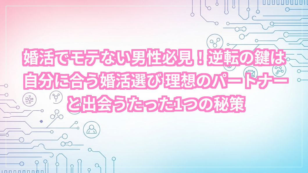 婚活を始めたものの、「自分はモテない男性なのか…」と、自信をなくしていませんか。理想のパートナーと出会いたいのに、思うように進まない婚活に悩むあなたの気持ち、痛いほどよく分かります。でも、大丈夫。諦める必要は全くありません。このページでは、あなたの婚活を逆転させ、自分にぴったりの婚活方法を見つけるための具体的なヒントを、優しく丁寧に解説していきます。さあ、一緒に理想の未来へ踏み出しましょう。